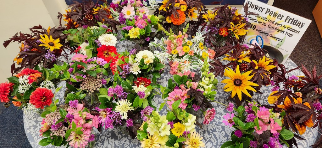 I brought two bouquets with the last of the Euphorbia marginata (Snow on the Mountain) for the season; I’ll miss them! Such a hard-working, long-lasting super trouper filler for bouquets (once I learned to dip the freshly-cut stems in boiling water, that is…)