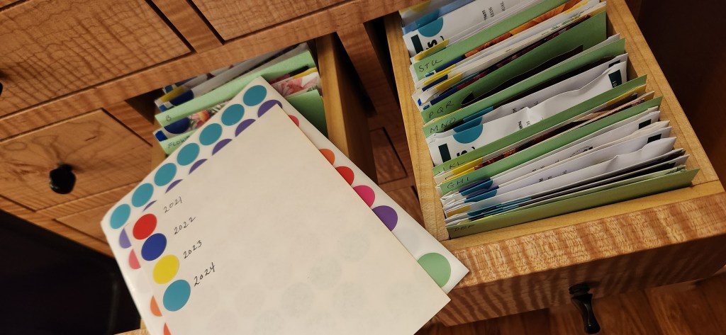 Most seeds are viable for a couple of years. (Seed viability chart from Johnny’s Seeds.) Finding the dates on the packets from many sources can be an annoyance, and some don’t even have them. (What’s up with that, Park Seed?) My new color-coding system makes it easy to see which seeds are less fresh and allows for a quick thinning of older seed at the end of the season.