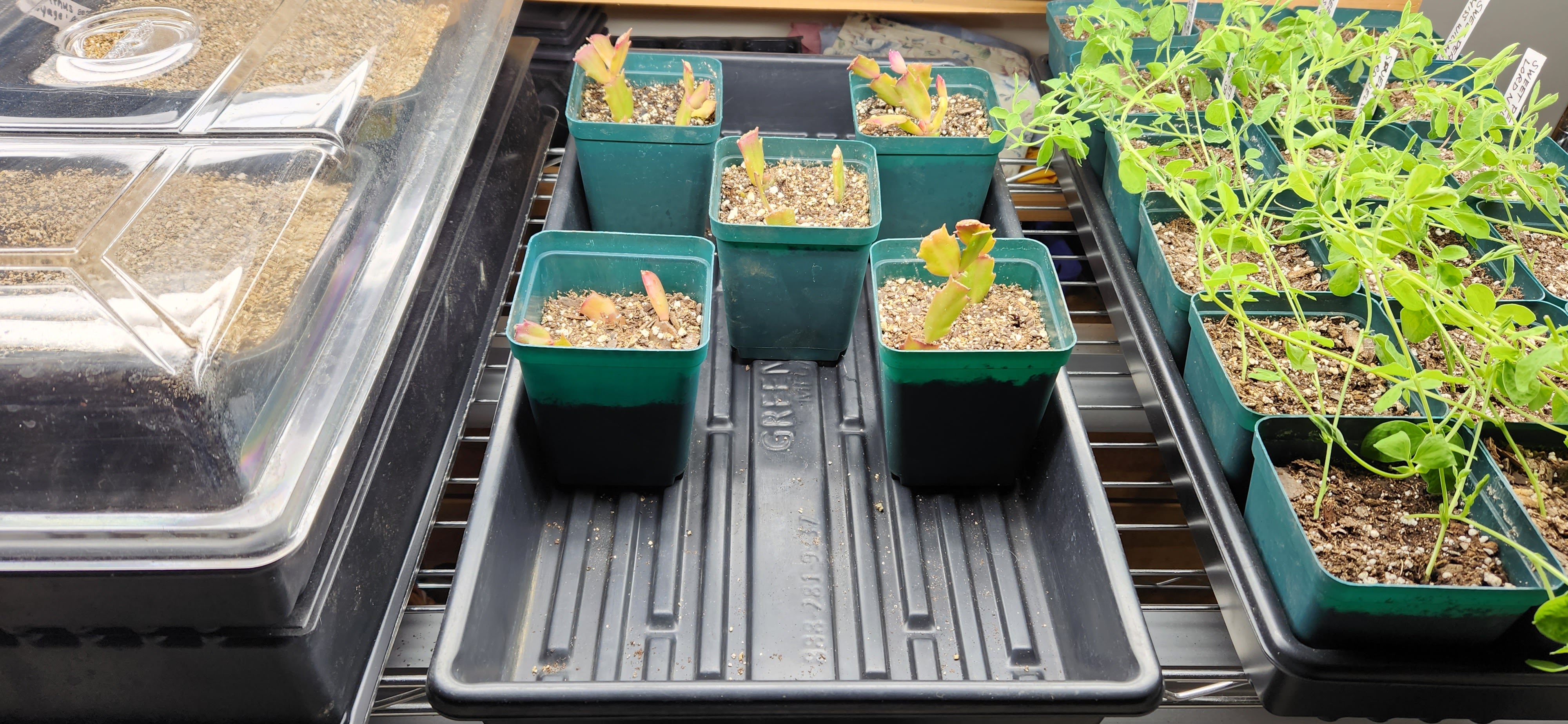 My first shelf is lit! Sweet peas growing on at the right, rescued broken bits from a Christmas Cactus rooting, and I started two flavors of Lisianthus today — Apricot and Chocolate-cherry!