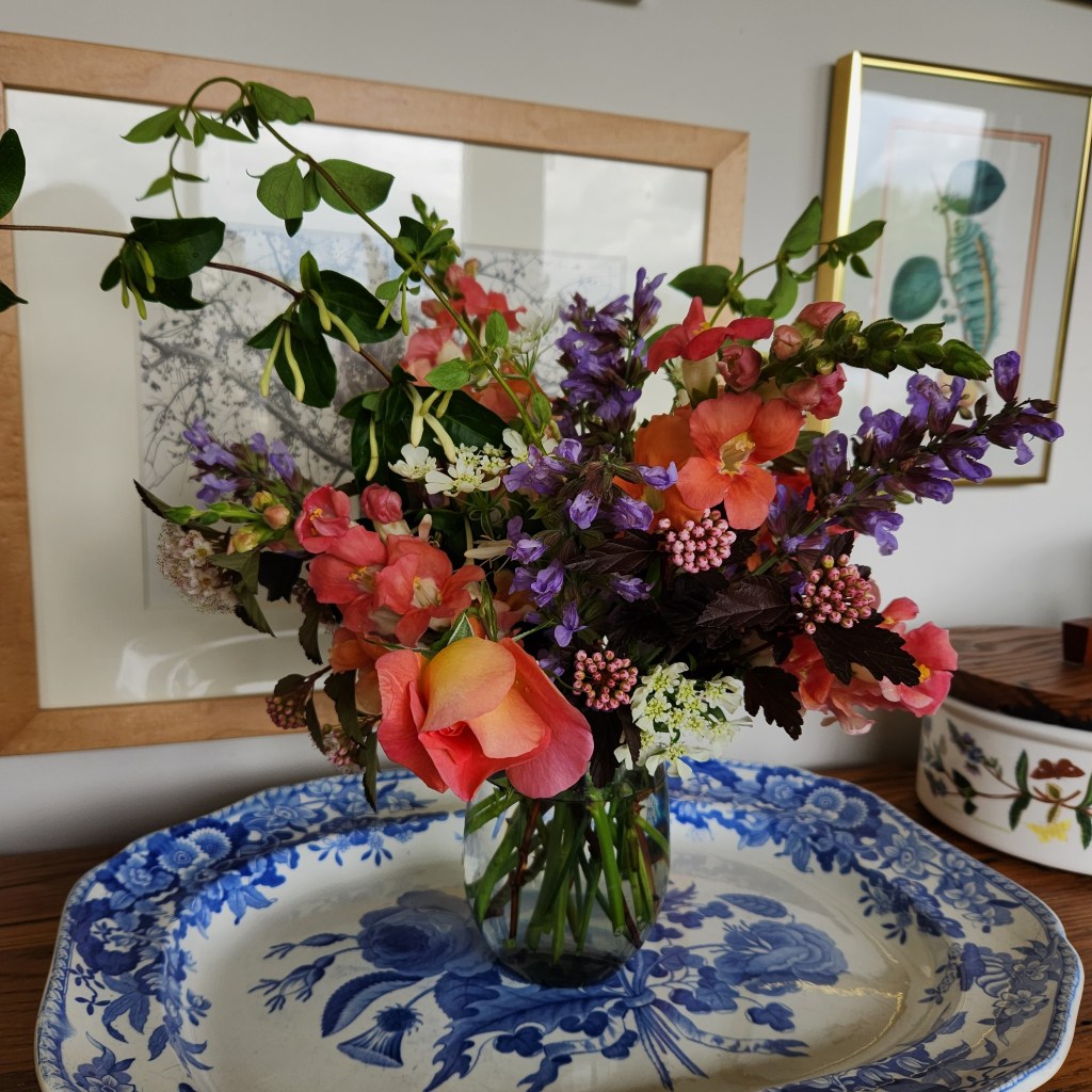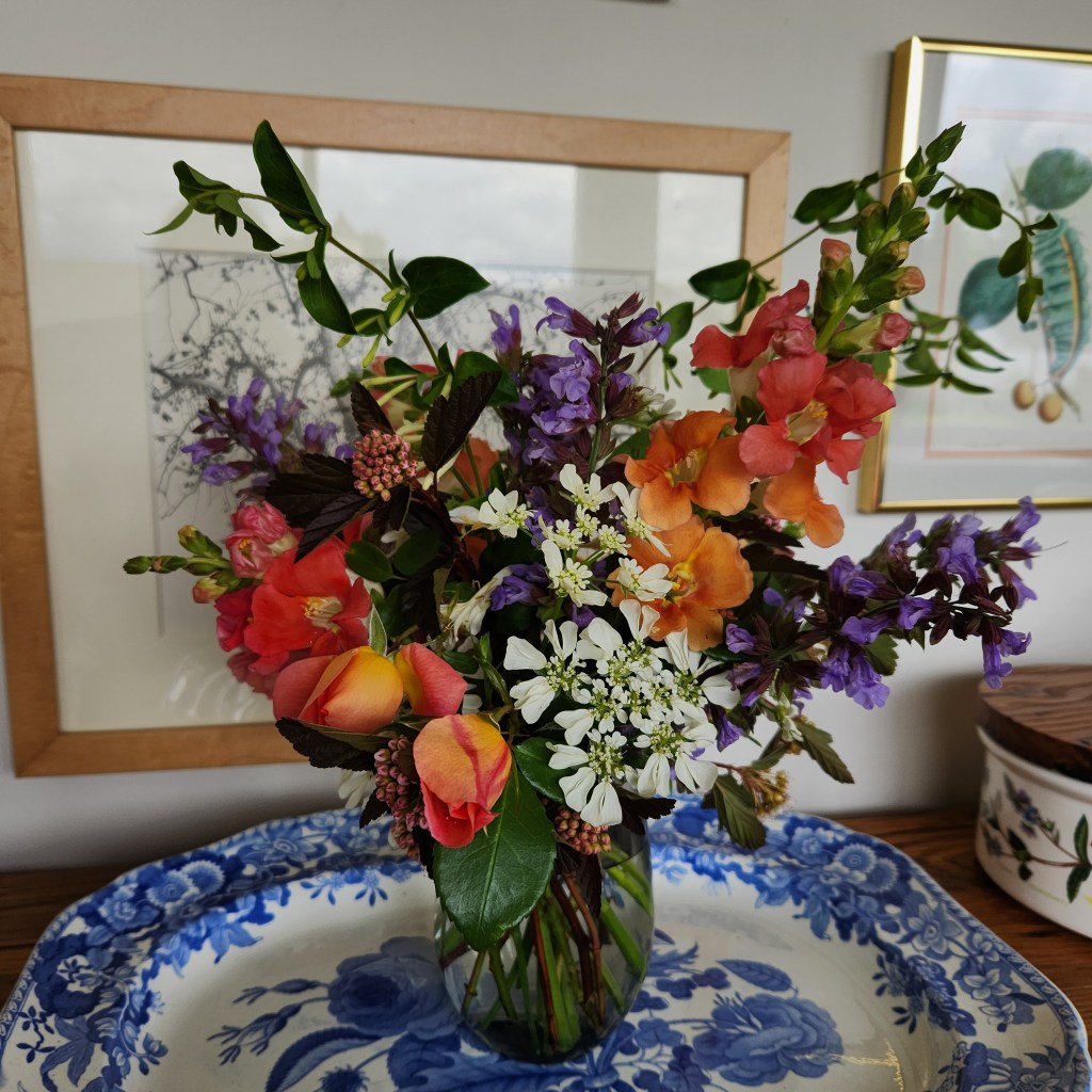Roses, Snapdragons (Chantilly), Orlaya grandiflora, Sage officinalis, Honeysuckle (Lonicera japonica; I’ll use it until I can get rid of it), and Ninebark (Physocarpus opulifloius)