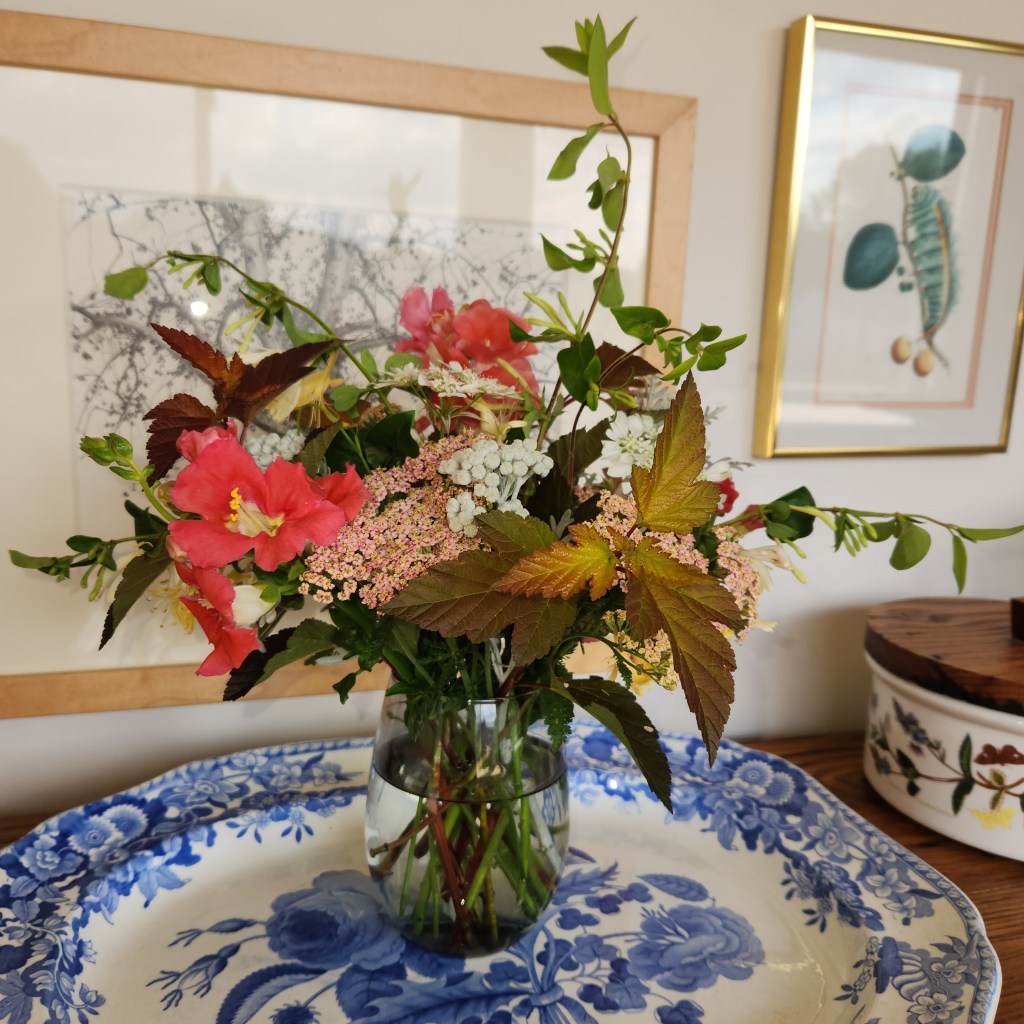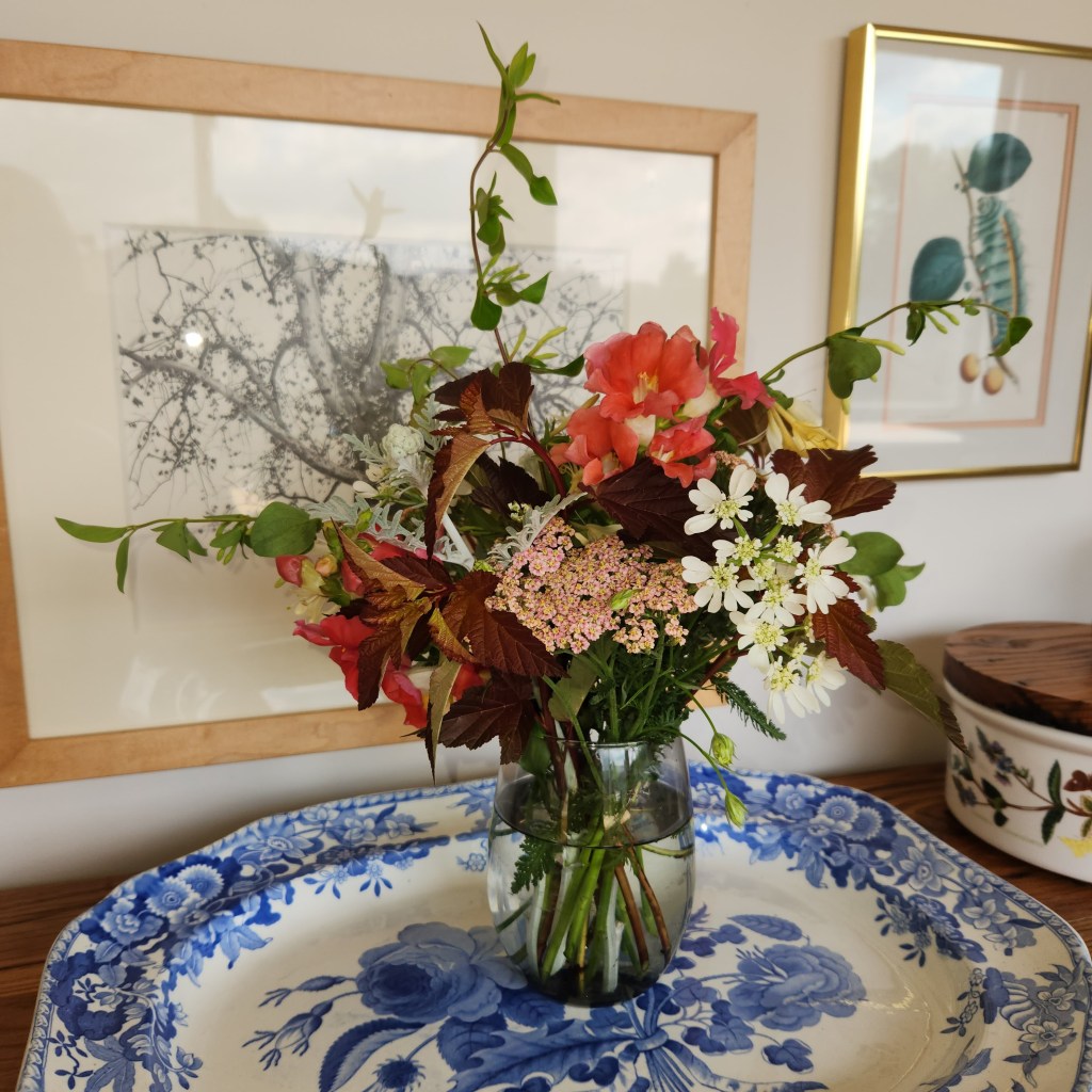 Snapdragons (Chantilly), Yarrow Colorado Blend, Orlaya grandiflora, Sage officinalis, Honeysuckle, and Ninebark (Physocarpus opulifloius)