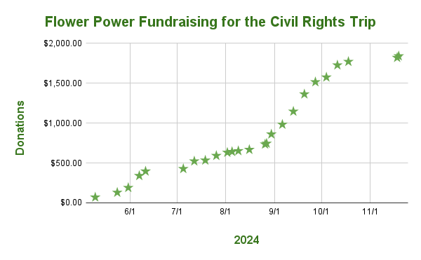 Bouquets are $12, where 10.50 goes directly to the Civil Rights Trip, and 1.50 goes to the grower. When there is produce available, all of the pay-as-you-are-able funds are donated, and the same goes for “tips” or keeping-the-change. Financial documentation is available upon request.