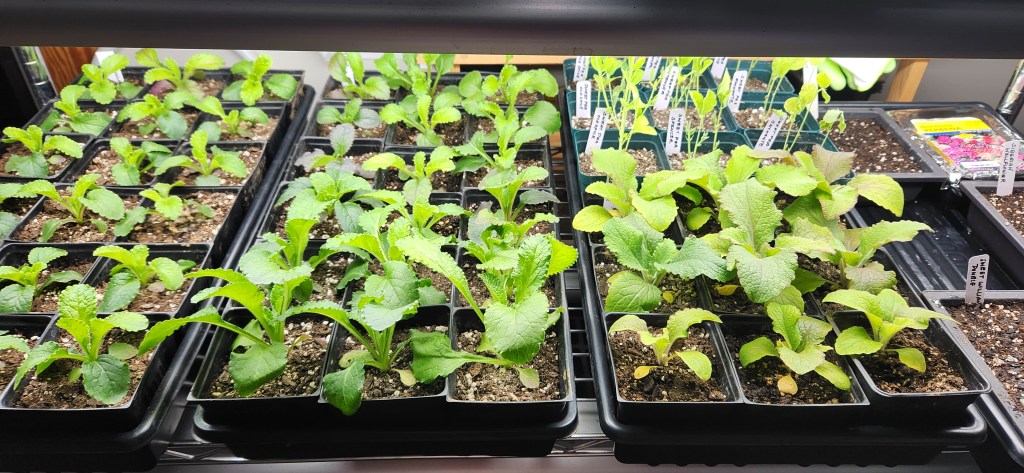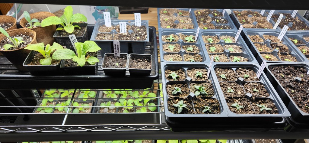 Top: Canterbury Bells, Foxglove ‘Camelot Rose’, Sweet Peas, and some seeds started today: Foxglove ‘Pink Gin’, Sweet William, Verbena ‘Ideal Florist’, and Siberian Wallflower.