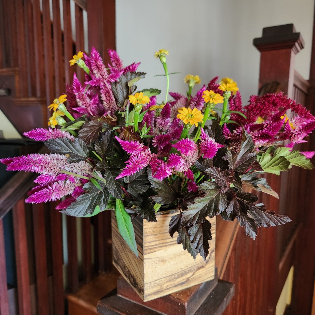 Bouquet for a friend What to pick at the end of a hot day that won’t flop? Ninebark, Celosia, and Zinnias! Share this: Click to share on X (Opens in new window) X Click to share on Facebook (Opens in new window) Facebook Like Loading... Related