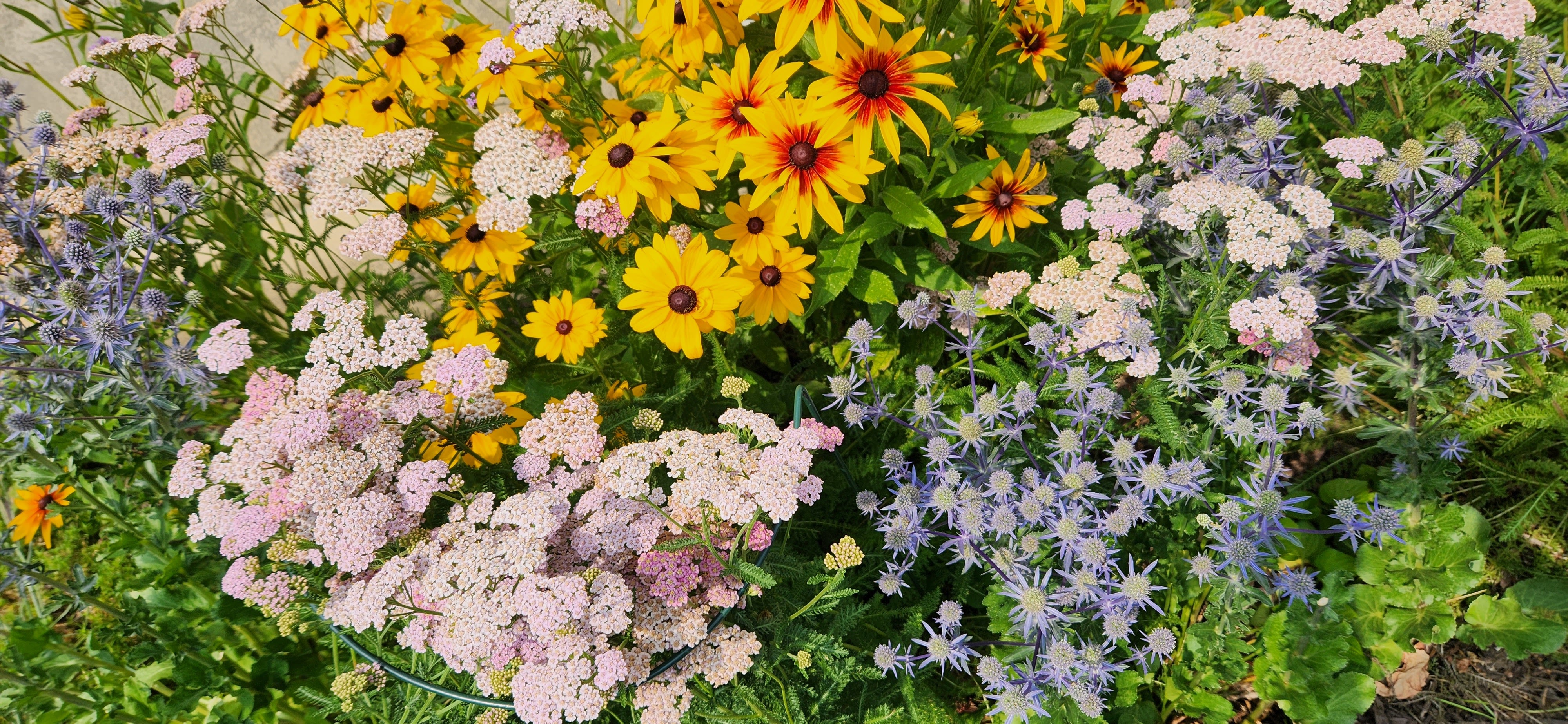 I finally found plants that will thrive by the AC unit, where they get full shade in the morning and baking full sun in the afternoon — Rudbeckia, Yarrow ‘Cerise Queen’, and Eryngium ‘Blue Glitter’. I’m also cultivating a wall of Big Bluestem grass in hope of keeping the AC unit in shade.